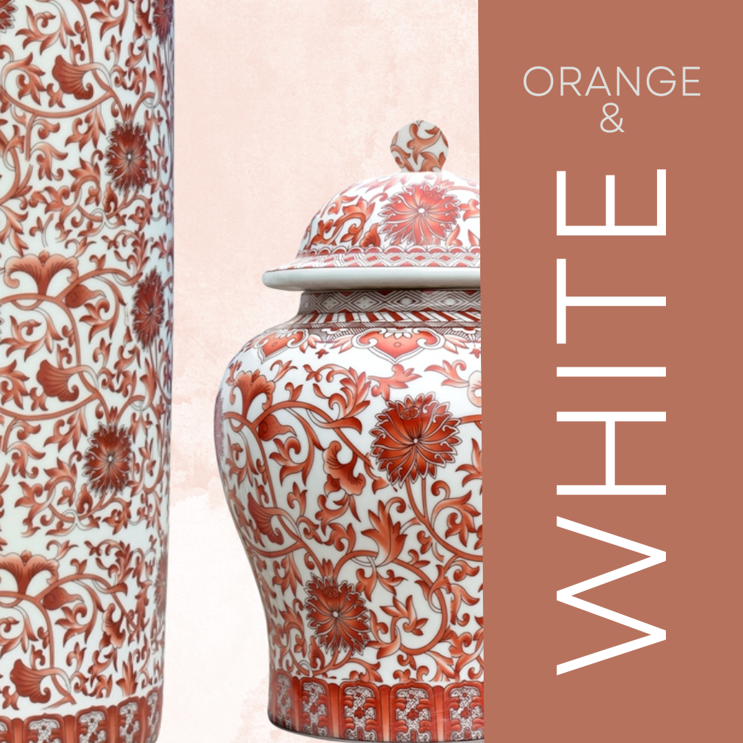 Beautiful Orange/Coral And White Porcelain Chinoiserie Temple Jar 13"