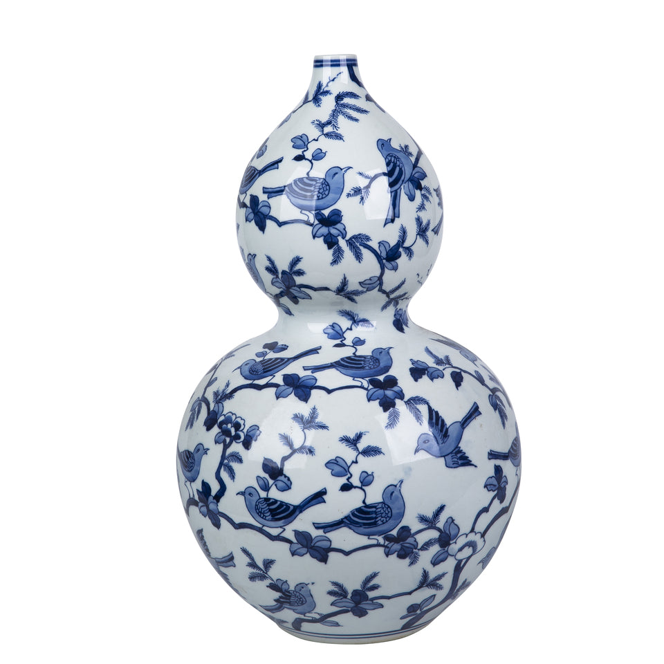 Blue and White Bird Motif Porcelain Gourd Vase 15"