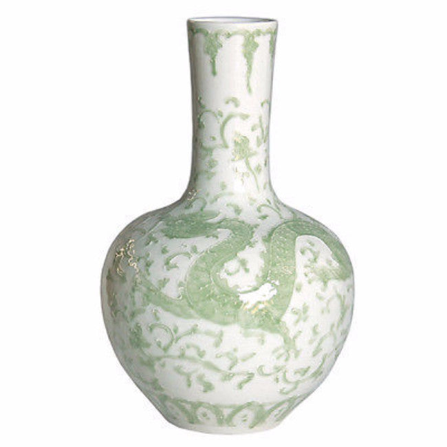 Beautiful Green and White Porcelain Medallion Plum Shaped Vase Dragon Lotus 21"