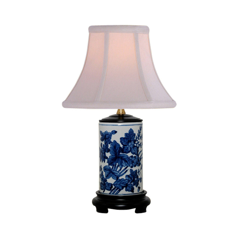 Blue and White Floral Motif Cylindrical Porcelain Vase Table Lamp 15"