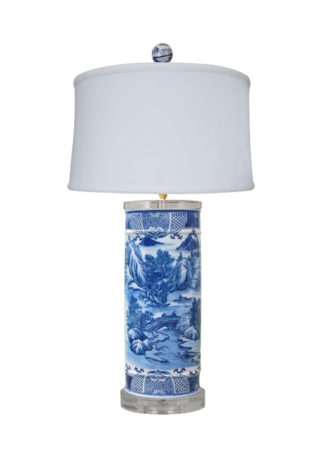 Blue and White Landscape Cylindrical Porcelain Vase Table Lamp 29"