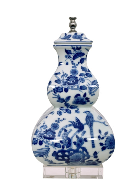 Chinese Blue and White Porcelain Gourd Vase Floral Bird Motif Table Lamp 25"