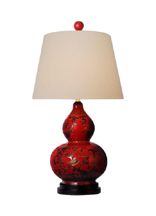 Chinese Red Lacquer Porcelain Gourd Vase Table Lamp Shade and Finial 24"