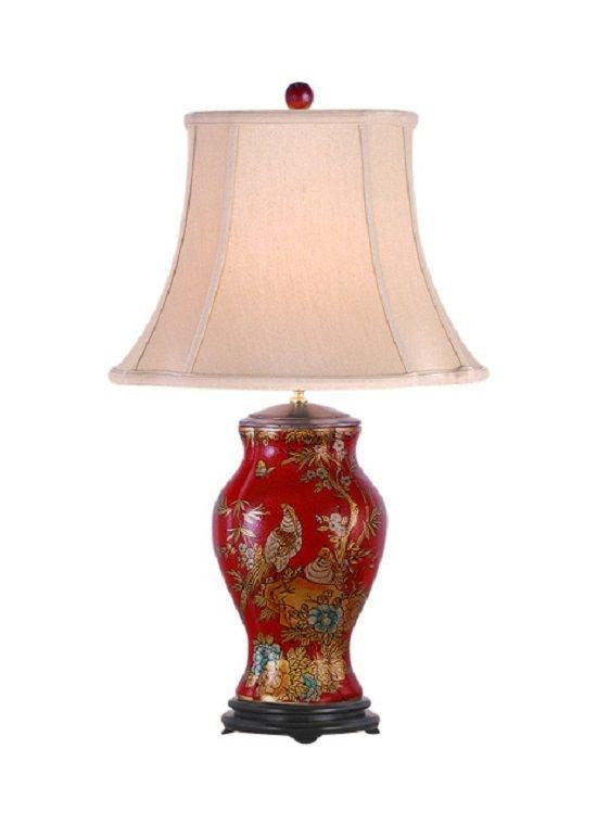 Beautiful Chinese Red Lacquer Vase Bird Table Lamp with Shade and Finial 27"