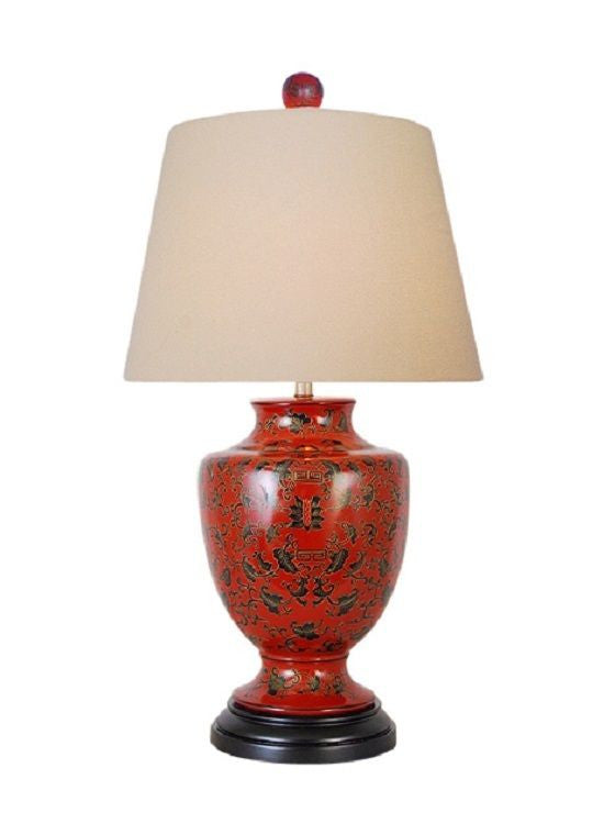 Beautiful Chinese Red Lacquer Vase Table Lamp with Shade and Finial 28.5"
