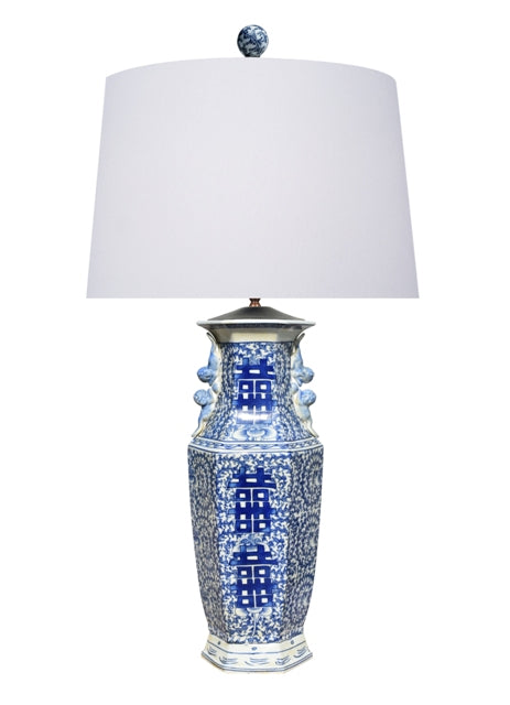 Blue and White Double Happiness Hexagonal Vase Lamp 37"