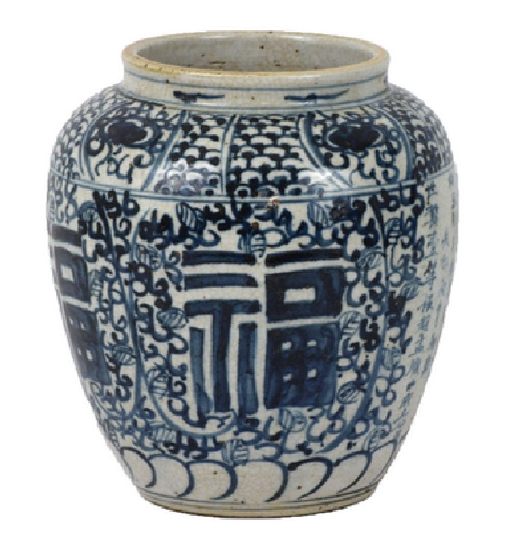 Vintage Style Reverse Blue and White Porcelain Lucky Motif Flower Vase 8"